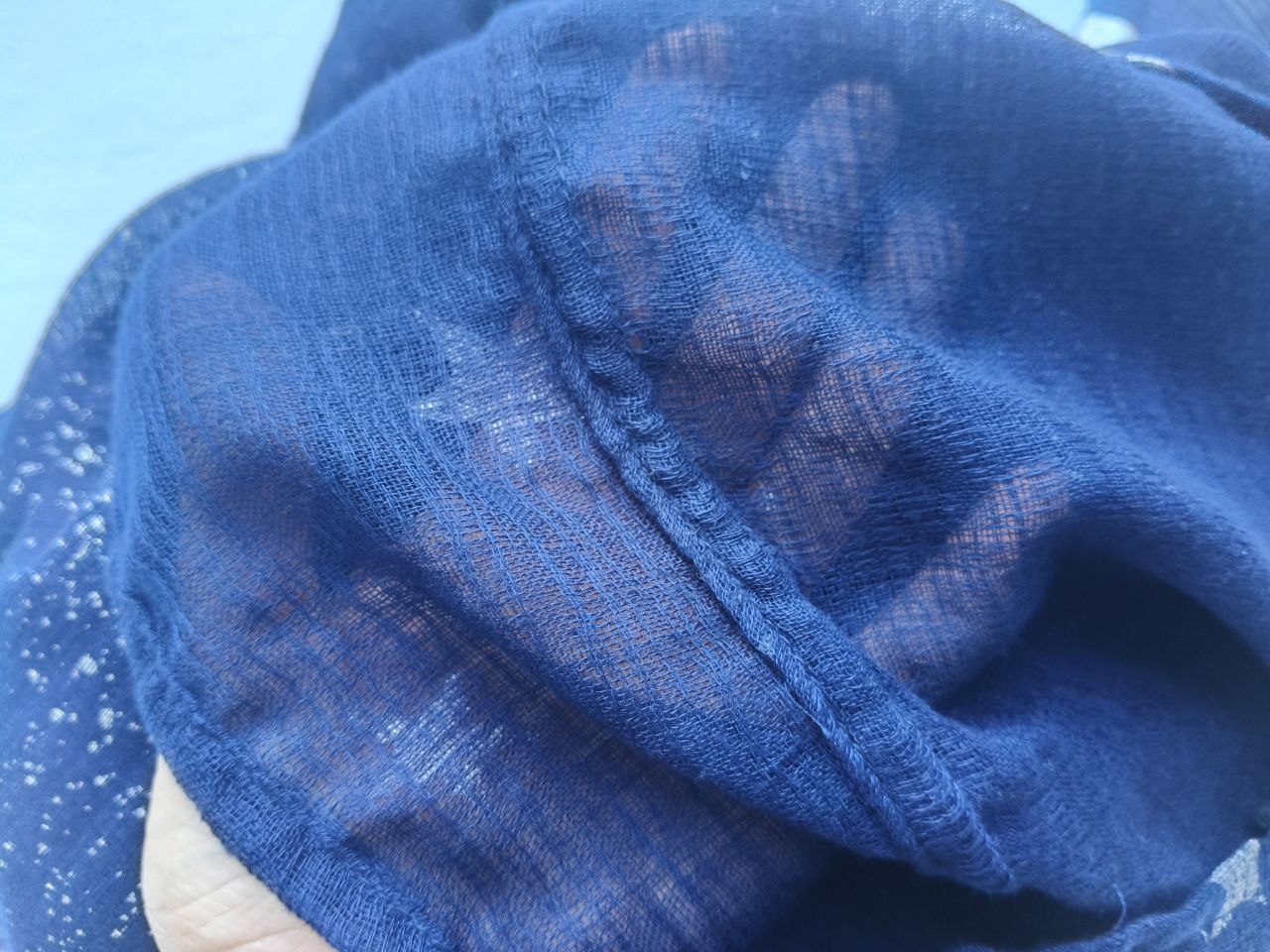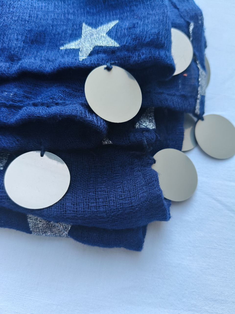 Blu indaco con fantasia “cielo stellato” e maxi paillettes pendenti ai bordi. Morbida viscosa, luminosa e versatile.